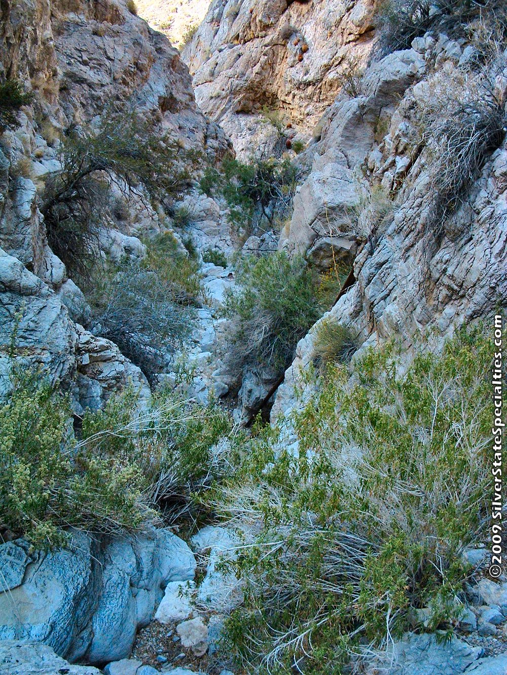 Information about the Bertha Mine (and most mines in the Goodsprings District) is almost non-existent, and all I know about it is that it is just about the most remote & difficult to access mines in the District; it can only be reached after a long, difficult, arduous hike up a steep canyon, requiring climbing up steep dropoffs and scrambling over large boulders, as well as crashing through thorny bushes choking the canyon floor. A direct route was once in place, but it has long since washed away. Bypassing the canyon floor is not feasible, since the abundance of sheer cliffs and rock faces prevents skirting the canyon floor. We specifically waited for cooler weather before attempting this hike, as there is NO water available in the area.