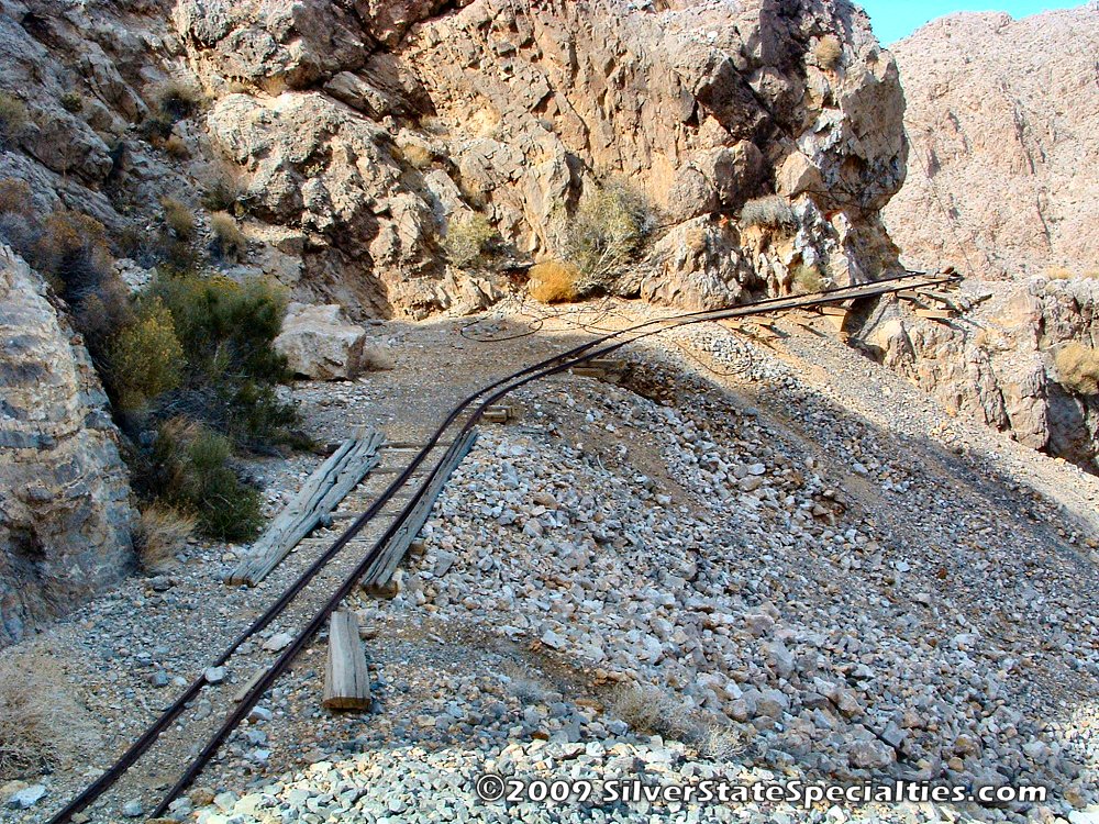 From the ore loading hopper, the mining rails continued on around the bend in the rock.