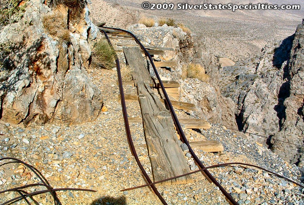 From the ore loading hopper, the mining rails continued on around the bend in the rock.