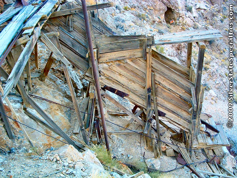 Around the bend in the rock, at the end of the rails, we find this ore hopper, with cables running in & out of it. It appears that the ore from the mine (via the incline) was dropped into the previous ore loading hopper, dropped into ore cars to be transported around the bend in the rock to this ore hopper; from here the ore was dropped into aerial tramway buckets to be transported down the mountain to the milling/refining facilities at the base of the mountain.