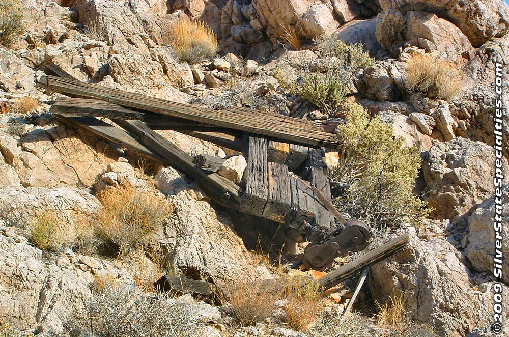 About halfway to the Valentine Mine, we find our first definitive evidence that an aerial tram system was in operation. These remains from an aerial tram tower were lying right next to the pack trail, and the only tram tower remains we found.