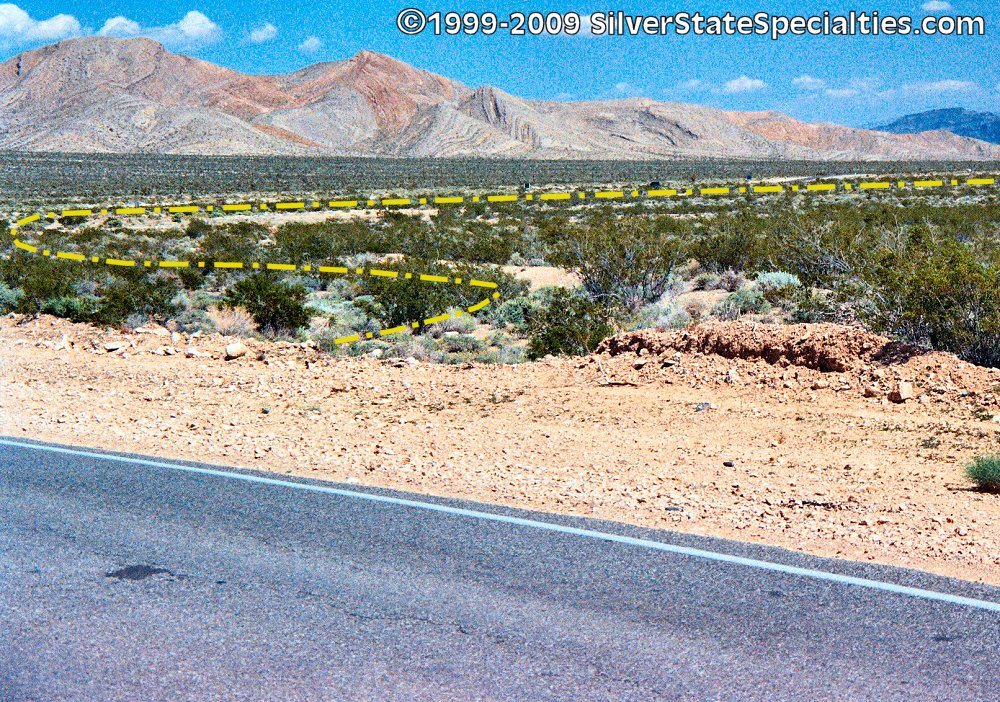 the steepness of the grade into Goodsprings. The dashed yellow line