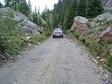 Old Colorado Midland RR grade on western slope of Continental Divide, west of Turquoise Lake. The CMRR spared no expense to carve a route through this rugged terrain,and it is still easily passable today; as you can see, we had an all-wheel-drive crossover vehicle, and we had no problems.