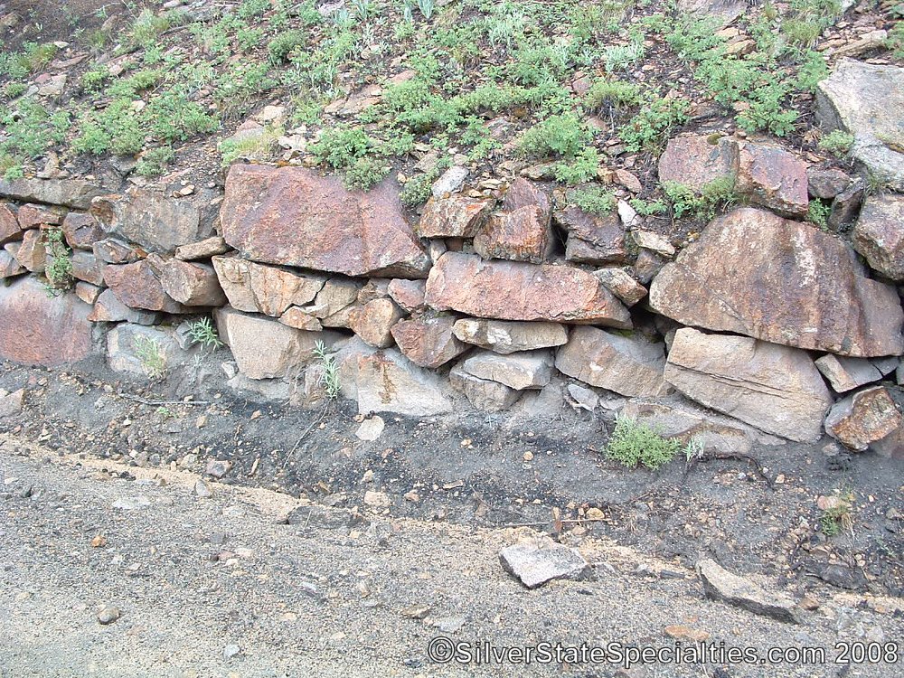 Old Colorado Midland RR grade on western slope of Continental Divide, west of Turquoise Lake. The CMRR spared no expense to carve a route through this rugged terrain,and it is still easily passable today; these retaining wall rocks have been in place for more than a century.