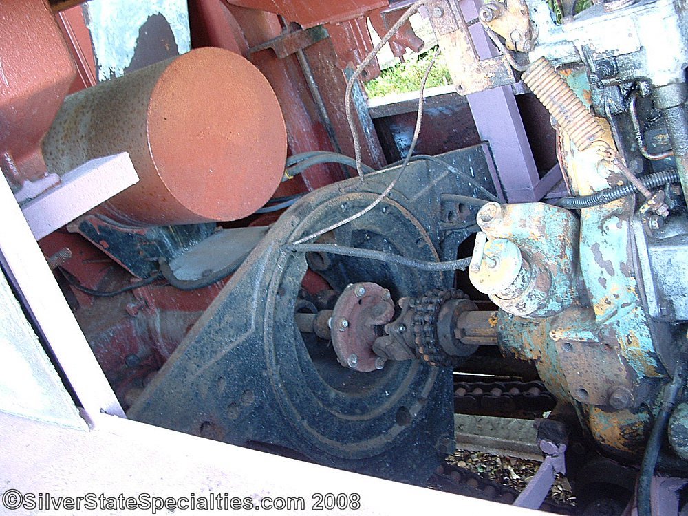 Right side view of the rear of the engine, looking back at the transmission and coupler shaft.