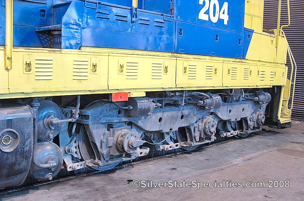 SD-9 Diesel Locomotive, in shops for unspecified repairs. Closer view of front trucks.