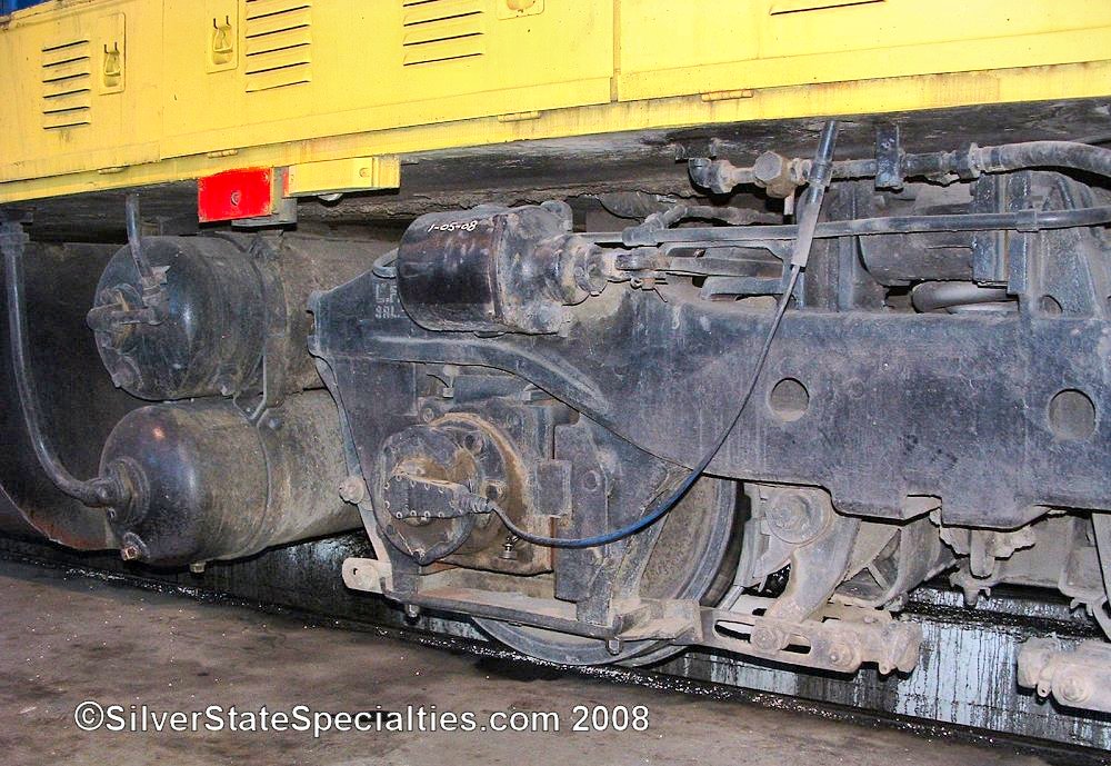 SD-9 Diesel Locomotive, in shops for unspecified repairs. Closer view of trucks.