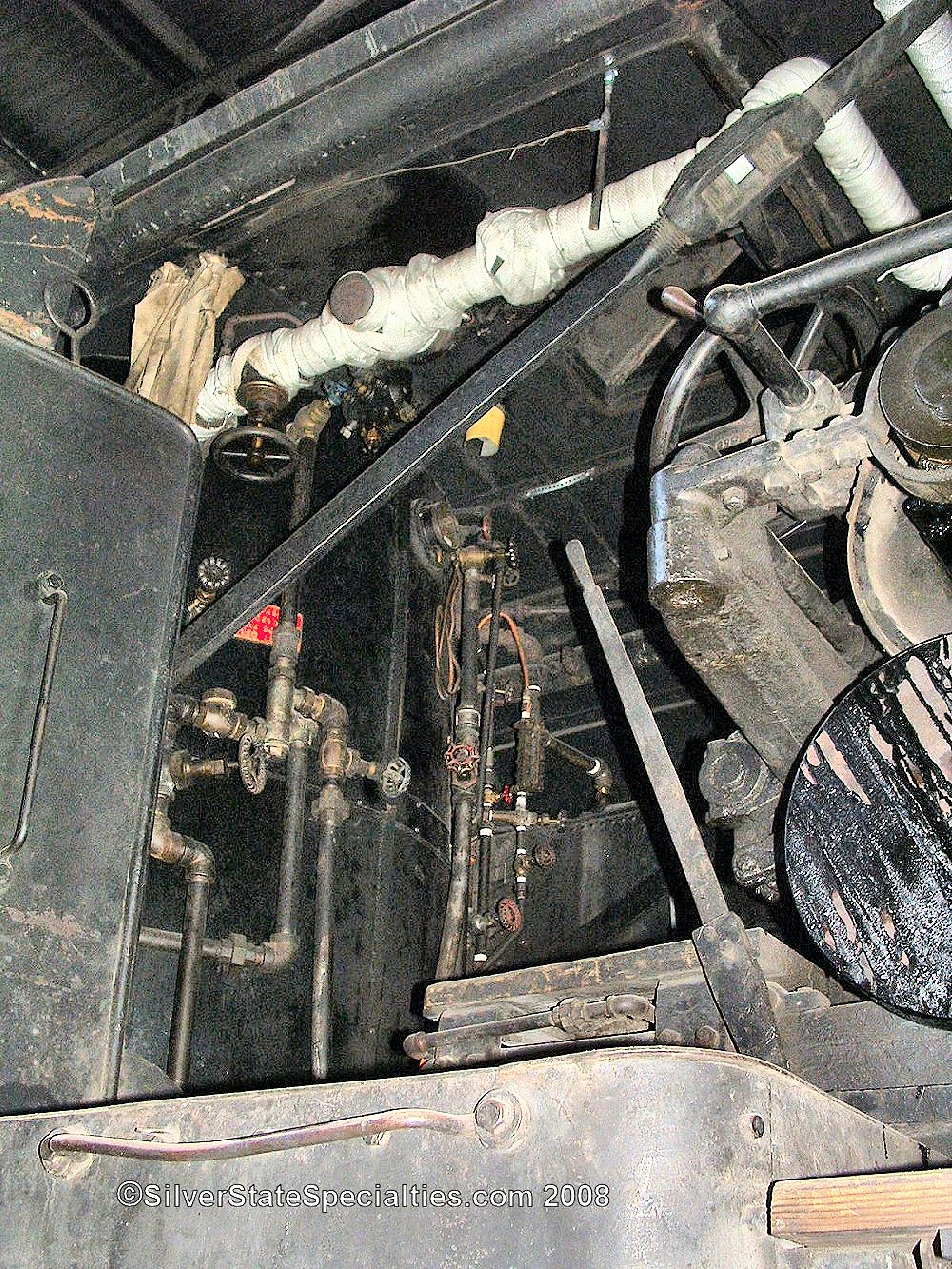 2008: Former Western Pacific steam-powered crane and tender workcar inside Ely shops. Closeup view of superstructure.