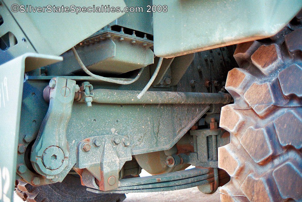 M1070 Oshkosh tractor & M1000 HET trailer, as photographed at the Las Vegas National Guard Armory in the mid-1990s. This view is looking at the left front tire & spring pack. Photo is scanned from a print.