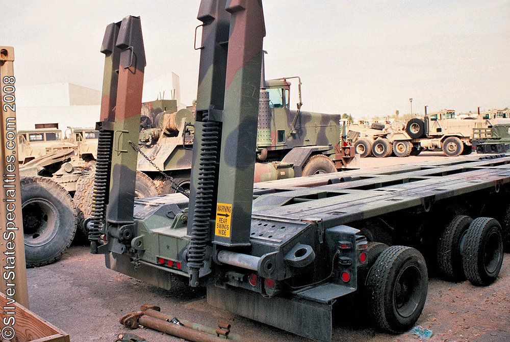 M1000 HET trailer, as photographed at the Las Vegas National Guard Armory in the mid-1990s. This view shows the loading ramps at the rear of the trailer. Photo is scanned from a print.