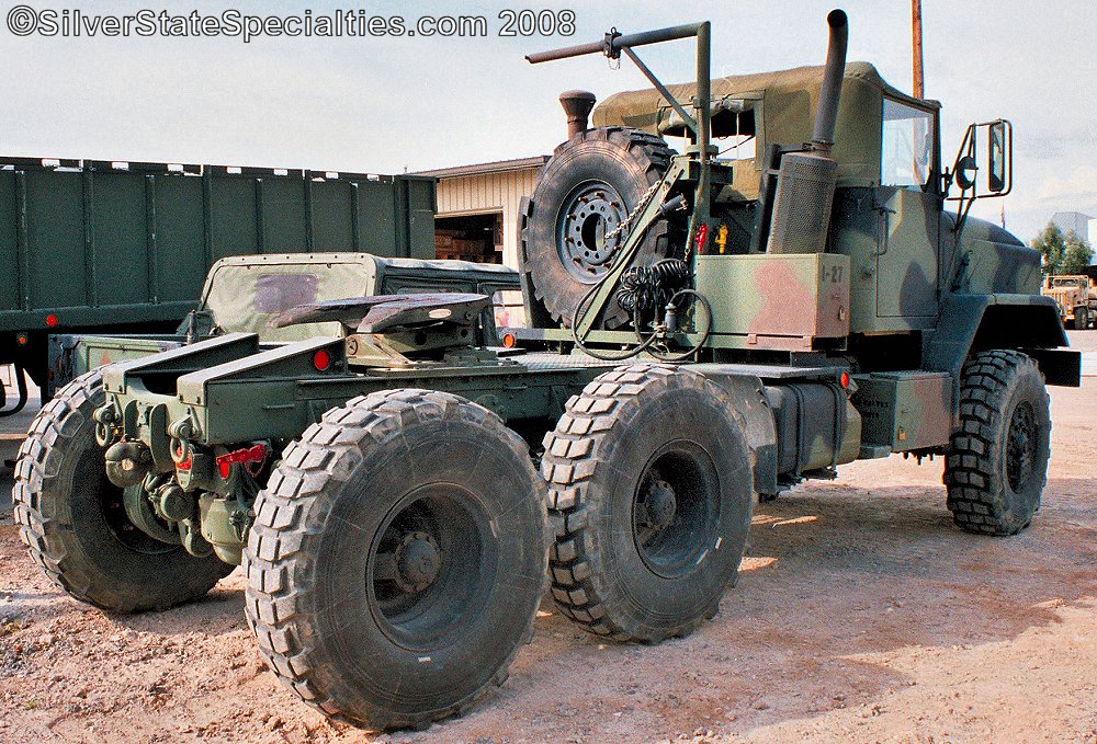 The M939-series trucks initially came equipped with 10.00x20 non-directional cross-country (NDCC) bias-ply tires (the classic military "knobbies"), but in the 1980s most were upgraded to A1 status, which included Super Single tubeless radial tires (such as this tractor pictured above) and an upgraded diesel engine. However, the original non-directional bias tires were found to be particularly dangerous in panic-braking situations on wet pavement and other low-traction situations, so the Army & Marine Corps were compelled to add various Anti-Lock Brake packages in later years; I particularly remember several fatal accidents around Camp Lejeune, North Carolina, in the late 1990s involving M939-series trucks with Super Single radial tires, and one significant finding was that fitment of Anti-Lock braking packages would significantly reduce these fatal occurrences. The US Army commissioned a study that found from January 1987 through June 1998 the M939-series trucks made up only 9% of the total Army Military Vehicle (AMV) fleet, but were responsible for 34% of the AMV fleets' accidents resulting in fatalities. Comparison of US DOT accident statistics to M939 accident statistics showed that over a 10-year period "the fatality rate of occupants of the M939 averaged about 30 times higher than the fatality rate for occupants of comparably sized commercial trucks. Also noted in the GAO report were the results of a TACOM tire study conducted from 1995 - 1997. That study concluded that the M939s were being used on road more than originally planned. The original intent was to drive the M939s on highway and secondary roads 60% of the time and 40% off road. Current data indicates the M939 trucks are being driven on roads 80-90% of the time and only 10-20% off road." As a result, the Army passed an order that these trucks could only be driven at 40mph on highways in an attempt to limit accidents, injuries, and fatalities. [All statistics and quotes from GlobalSecurity.org]