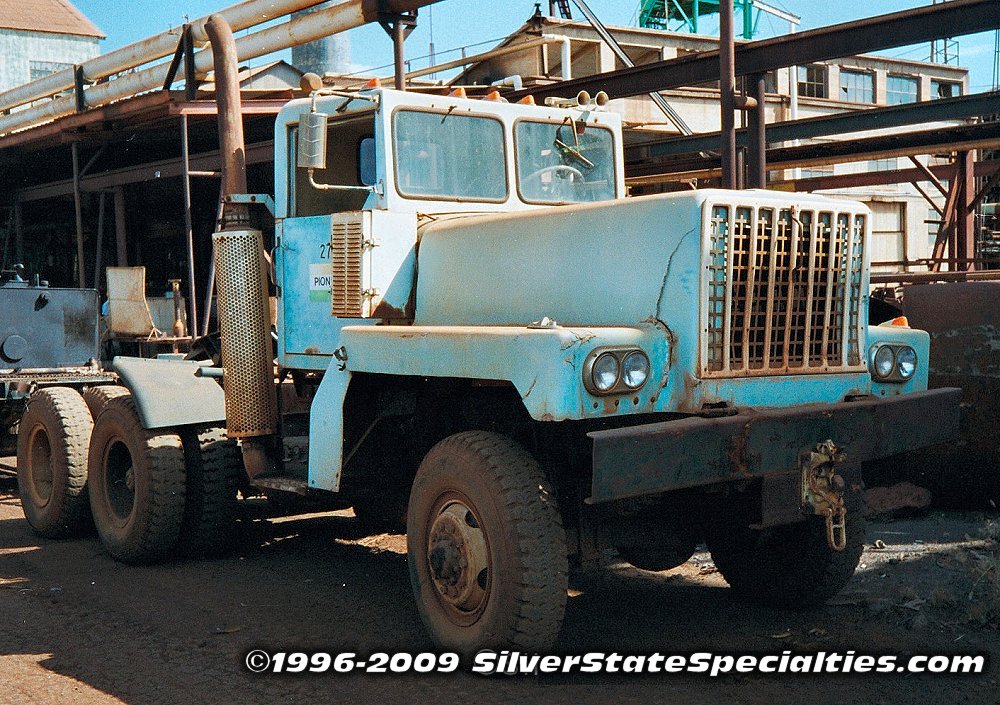 Pioneer Sugar ex-military 5-ton 6x6 tractor unit. Truck has had an aftermarket fiberglass one-piece front clip installed to replace the former GI-Issue steel hood & fenders; in fact, cracks in the fiberglass front clip are pretty obvious. I have seen this type of one-piece fiberglass front clip installed on surplus 5-tons that are most often converted to water trucks. The hard top and/or windshield mounting may or may not be aftermarket replacements installed after auction. This unit has definitely seen better days.