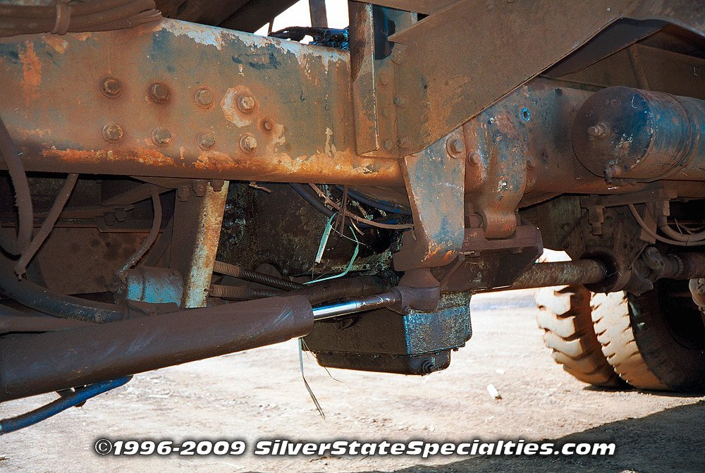 Pioneer Sugar Kenworth heavy-duty 6x6 cane haul truck. Close-up view of front of transfer case and steering ram.