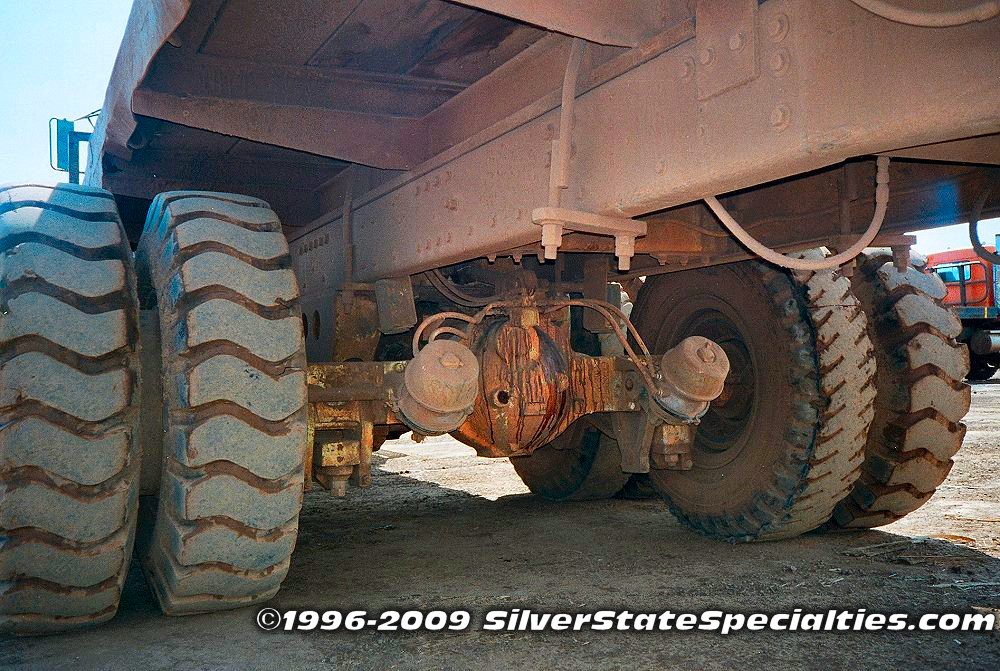 Pioneer Sugar Kenworth heavy-duty 6x6 cane haul truck. Close-up view of rear axles & suspension.