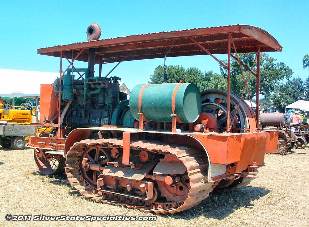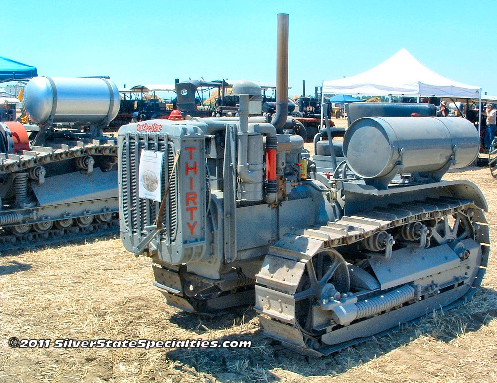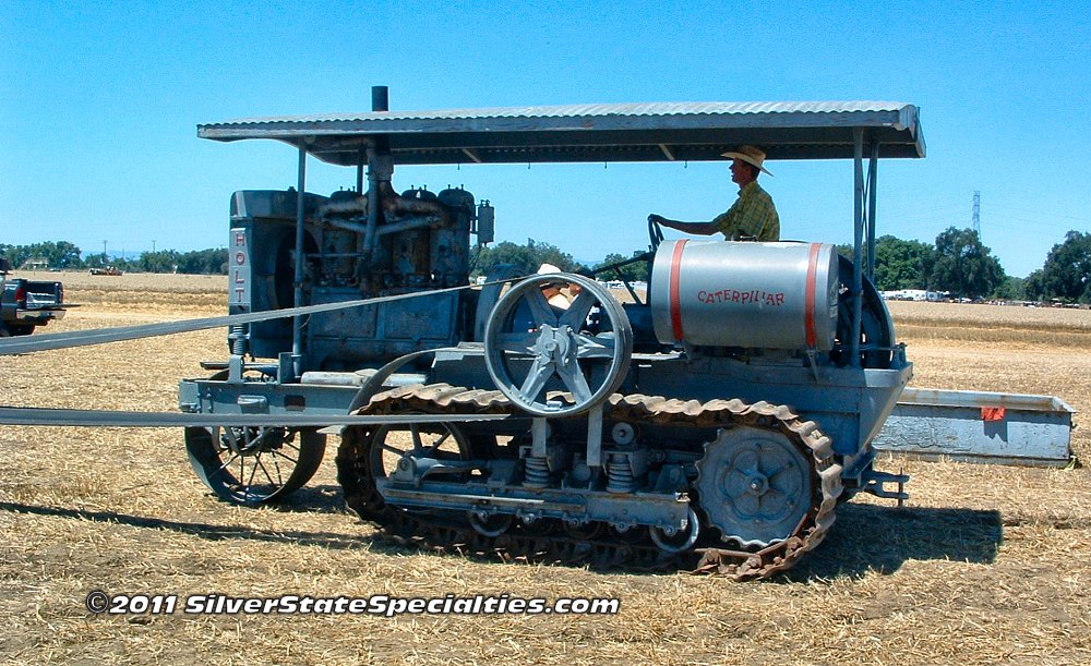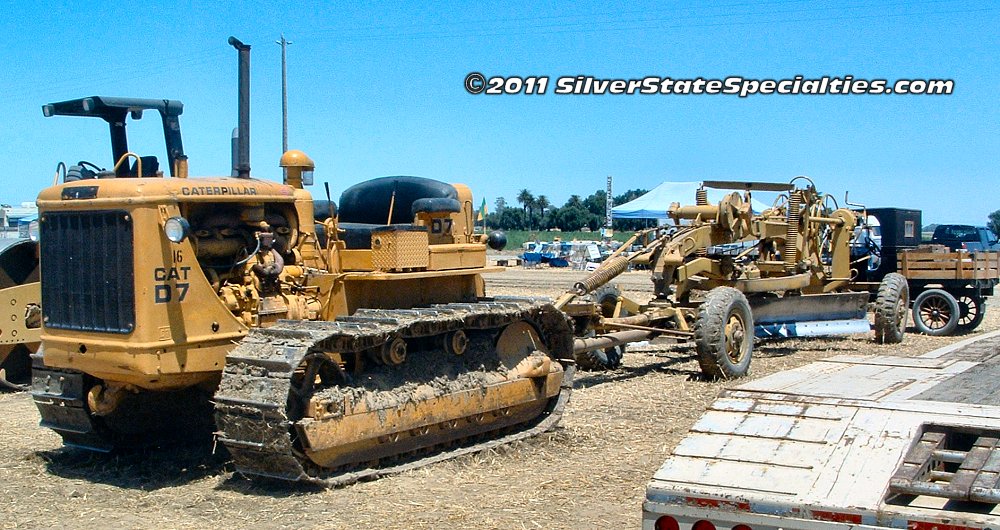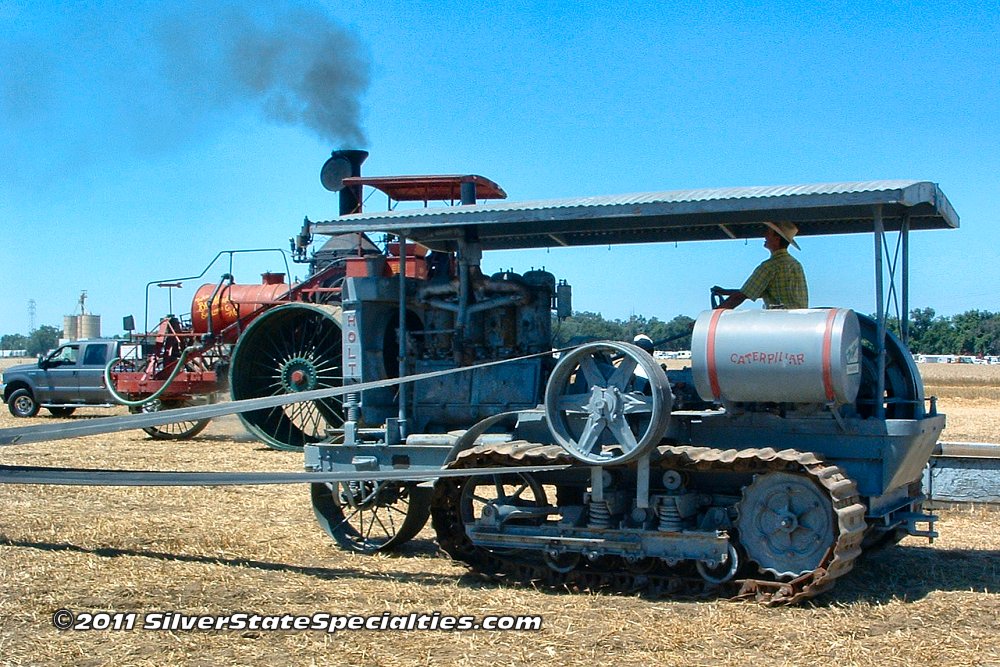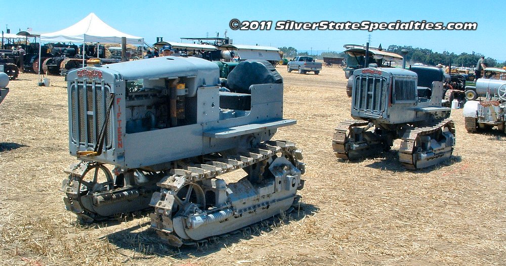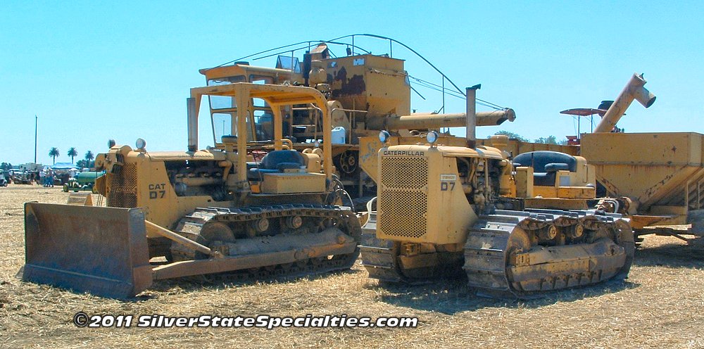 A pair of Caterpillar D7s pulling tracked combine wagons