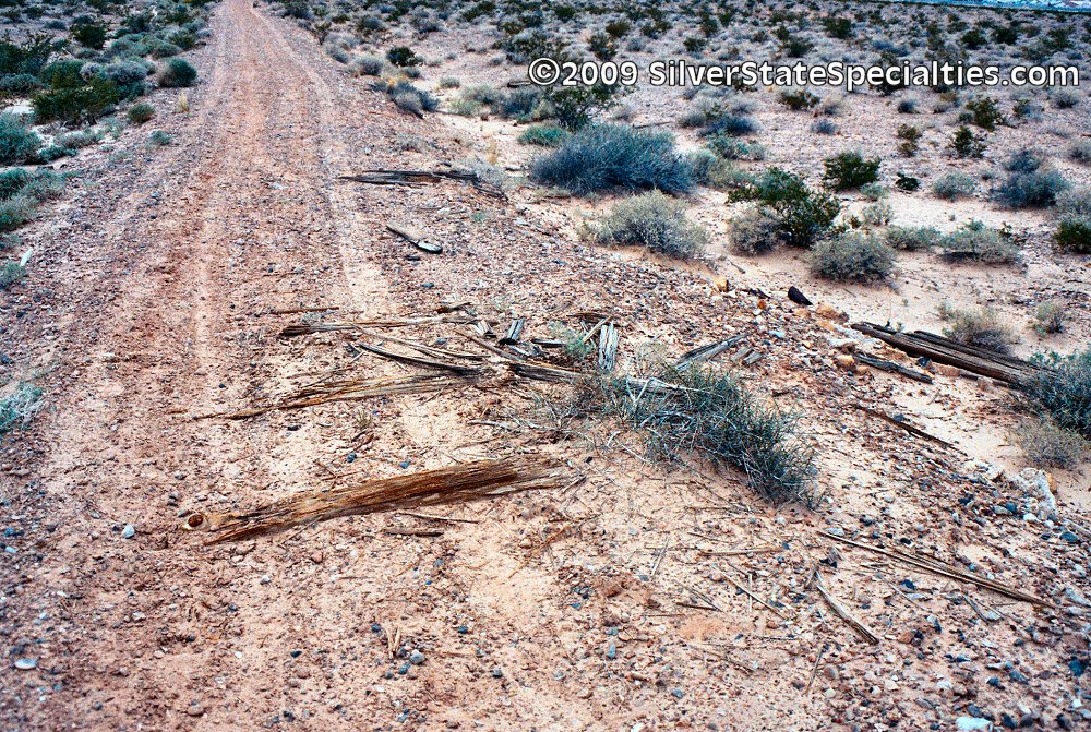 Once ore was loaded from the mines into the APRR ore cars, it was then hauled 5 miles southeast to the Arden Plaster Mill at Arden, a station on the Union Pacific Railroad in the southern Las Vegas Valley. Nothing remains at Arden, as the old mill site has been built over by industry. At one time the entire APRR grade could be followed from Arden all the way to the mines, but in recent years the majority of this grade has been built over by custom homes & housing developments. Some of the 1999-era photographs below document what used to be, but is no more...however, once at the mines, extant railroad grades and spurs are remaining to be explored. I've found pieces of rails, rail joiners, shoulder bolts & square nuts, many many ties with spikes still embedded in them, and various other remnants of the APRR over the years. The grades along the mines are loaded with detritus & remains of the former mining railroad, and in a few spots you can still see the piles of grease that dripped off the locomotives while they idled (it appears to be pavement, but it is grease with dirt & dust embedded in it).
