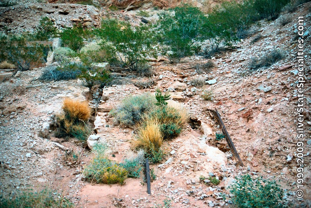 IMAGE MAP #13: We are back on the right side of the concrete foundations again, at the top of the incline loading system. 25-pound rails stick out from underneath piles of waste rock, and the gauge appears to be 3 feet, the same as the railroad below and the railroad serving the mines proper.