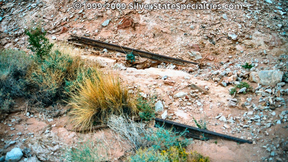 Once ore was loaded from the mines into the APRR ore cars, it was then hauled 5 miles southeast to the Arden Plaster Mill at Arden, a station on the Union Pacific Railroad in the southern Las Vegas Valley. Nothing remains at Arden, as the old mill site has been built over by industry. At one time the entire APRR grade could be followed from Arden all the way to the mines, but in recent years the majority of this grade has been built over by custom homes & housing developments. Some of the 1999-era photographs below document what used to be, but is no more...however, once at the mines, extant railroad grades and spurs are remaining to be explored. I've found pieces of rails, rail joiners, shoulder bolts & square nuts, many many ties with spikes still embedded in them, and various other remnants of the APRR over the years. The grades along the mines are loaded with detritus & remains of the former mining railroad, and in a few spots you can still see the piles of grease that dripped off the locomotives while they idled (it appears to be pavement, but it is grease with dirt & dust embedded in it).